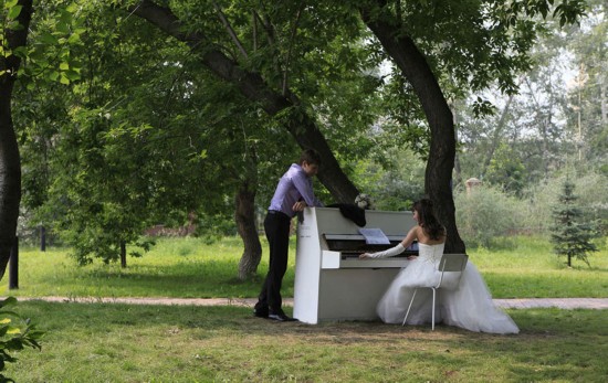 2013年8月9日,克拉斯诺雅茨克,一名新娘在公园内为新郎弹奏钢琴曲。一群音乐爱好者出资购买了一架老式的苏制钢琴,在经过重新修理并油漆后,这架钢琴被安放在克拉斯诺雅茨克公园内,共所有游客使用。 Ilya Naymushin/摄