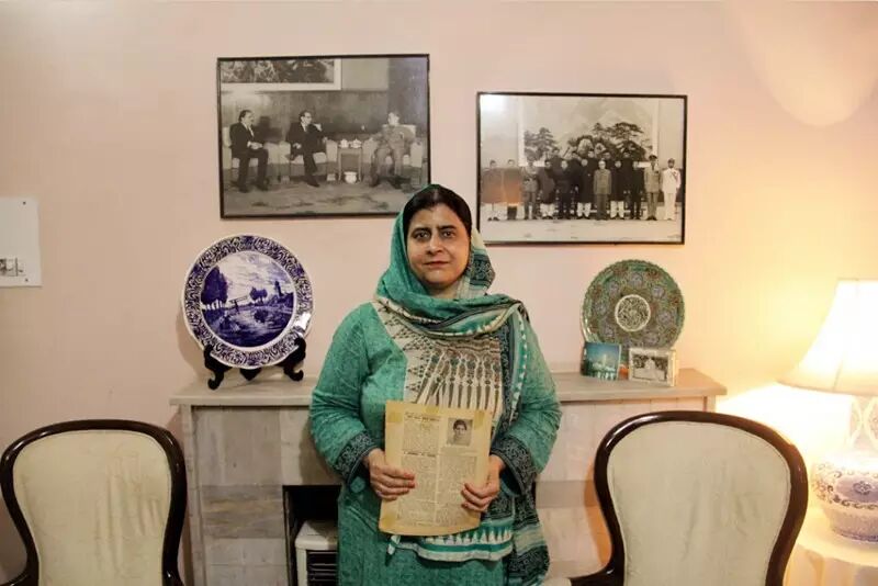 全巴基斯坦中国友好协会新闻秘书阿提亚在家中手持刊登有中国文章的杂志。她身后的照片中包括周恩来总理等中国领导人 杨迅 摄