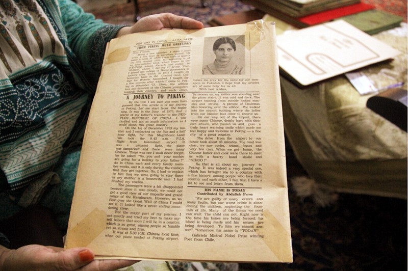 全巴基斯坦中国友好协会新闻秘书阿提亚向笔者展示她年轻时发表的关于北京之行的文章。 杨迅 摄