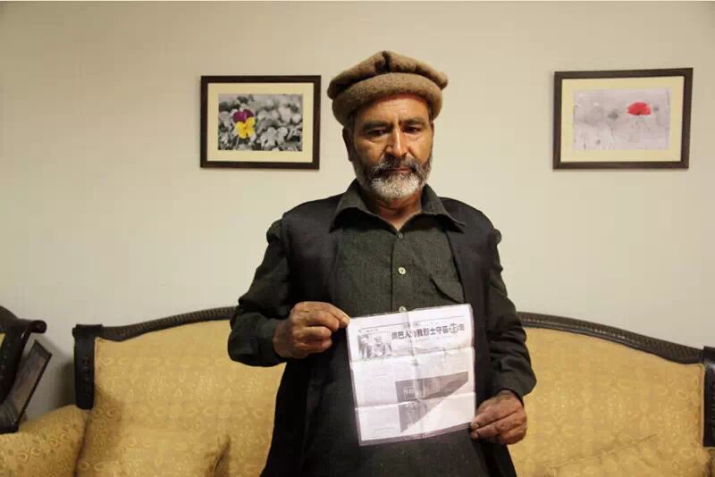 巴基斯坦吉尔吉特中国烈士陵园守墓者阿里﹒艾哈迈德手持相关报道。 杨迅 摄