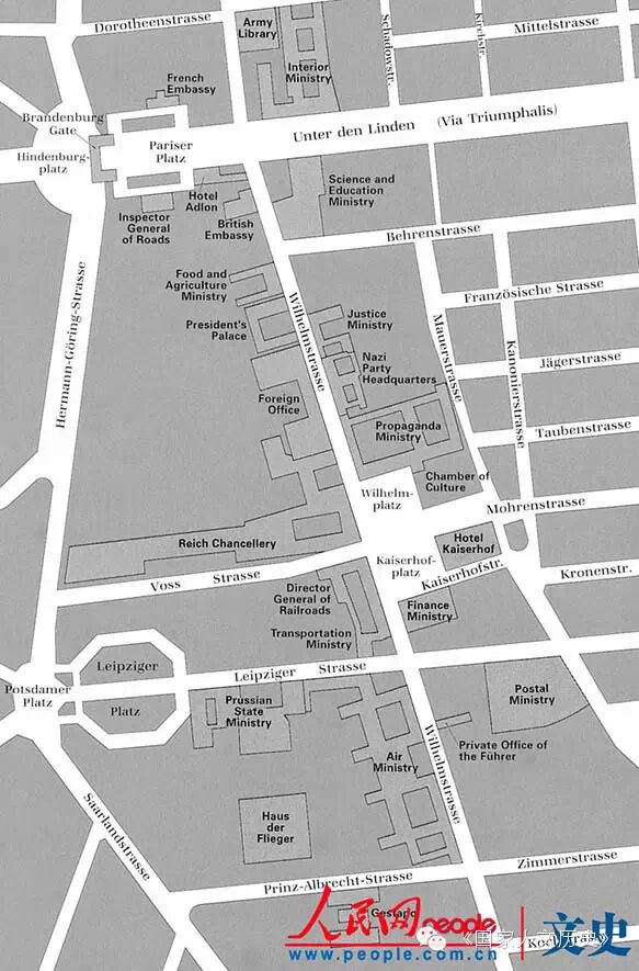 图为标明了柏林纳粹政府所在地的地图。当时是1939年1月,希特勒刚刚搬进了位于威廉街和沃斯街交汇处的新的帝国总理府( R e i c hChan-cellery)。元首的助手们都争取在靠近总理府的房子里办公:约瑟夫·戈培尔的宣传部(Propaganda Ministry)正好与总理府相对;赫尔曼·戈林的空军部(Air Ministry)与总理府隔了一个街区,位于威廉街和莱比锡人街的交汇处;与空军部只隔了一个街角的阿尔布莱希特亲王街8号是海因里希·希姆莱的盖世太保(Gestapo)所在地,这可能是第三帝国最令人生畏的地址。(供图:海南出版社《第三帝国》)