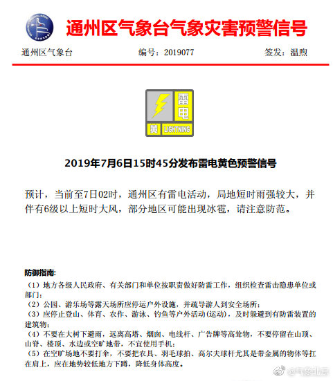 据北京市气象局官方微博@气象北京发布,通州、大兴区气象台发布了雷电黄色预警信号,今天傍晚到夜间有小到中雨,伴有雷电,局地可能有短时强降雨和6-7级短时大风,东部、南部降水较明显,请注意防雨防雷电。